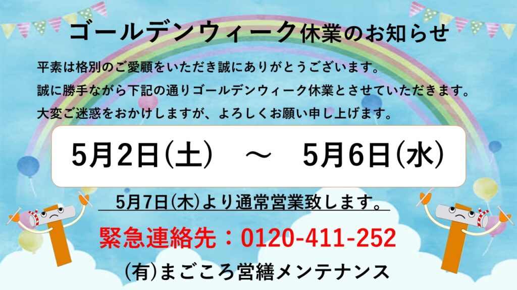 GW期間中の休業日をお知らせいたします。